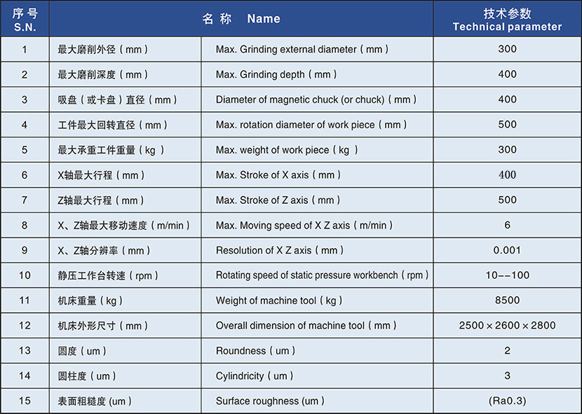 ![]() 1、本機(jī)床為二軸二聯(lián)動(dòng)數(shù)控立式外圓磨床,能對(duì)零件的外圓、外臺(tái)階面、外端面等多表面的磨削。 2、本機(jī)床為單立柱(Z軸)上架設(shè)橫梁(X)軸,(Z軸)作上下往復(fù)運(yùn)動(dòng),(X軸)為左右進(jìn)給移動(dòng),靜壓主軸固定在 床身上帶動(dòng)工件作回轉(zhuǎn),工件夾具采用磁性吸盤或卡盤。 3、機(jī)床為全封閉防護(hù),電氣柜安裝在床身后側(cè),移動(dòng)操縱箱位于機(jī)床右前方。修整器用于砂輪修整。具有自動(dòng)修整砂 輪、自動(dòng)補(bǔ)償?shù)裙δ堋?br /> 技術(shù)參數(shù)表: ![]() ※由于技術(shù)在不斷進(jìn)步,本內(nèi)容僅供參考,如有變動(dòng)恕不另行通知,以雙方簽訂的技術(shù)文件為準(zhǔn)。 |